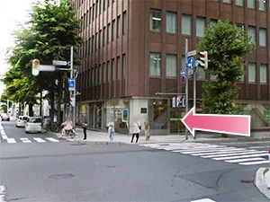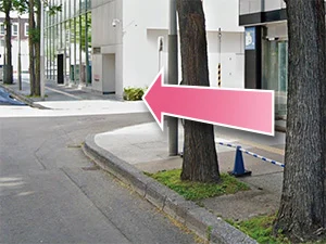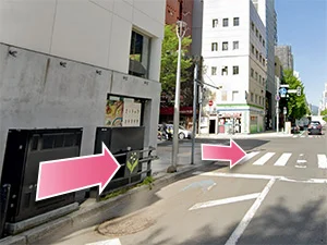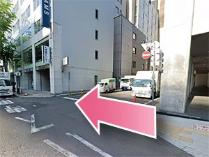 ②道なりに沿って進み、ビルの角を左に曲がります。