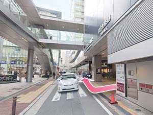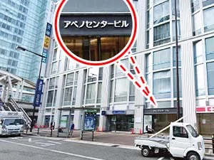 ①大阪阿倍野橋駅西改札口から出て、すぐ左に曲がります。