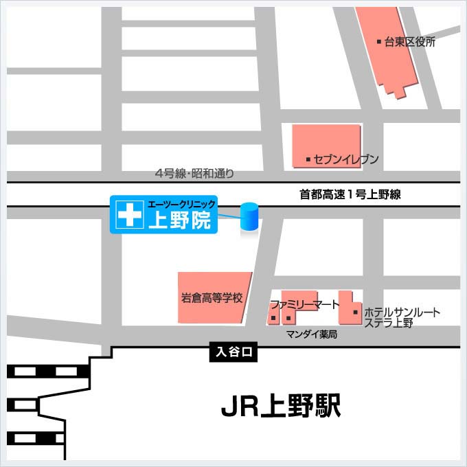 東京ノーストクリニック上野院は、JR上野駅 入谷口からから徒歩約30分と、目の前ににあります。