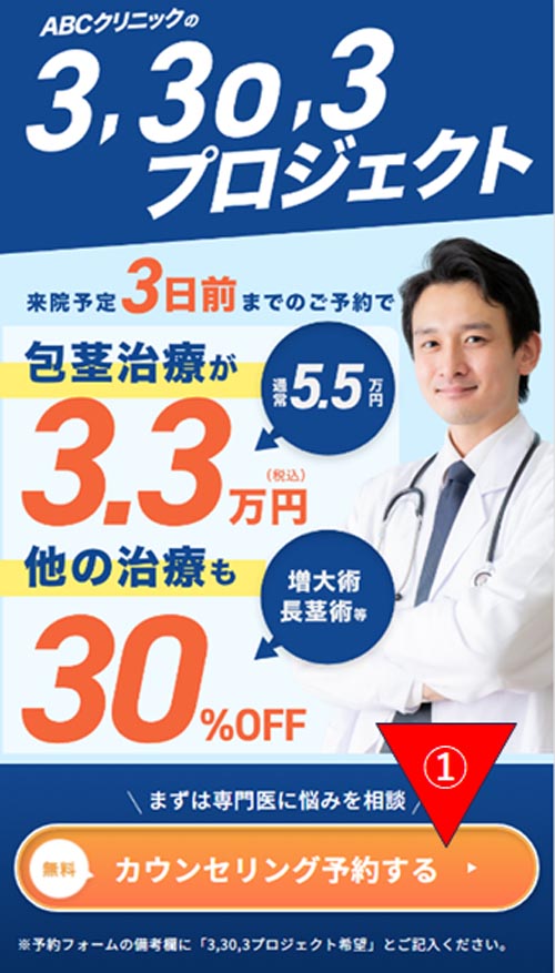 通常55,000円(税込)の包茎治療が、なんと33,000円(税込)に!これは、来院の3日前までに予約することで、すべての施術費が30%割引になる制度です。