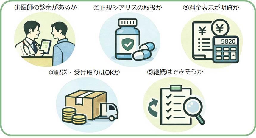 このような場合は、オンライン診療による通販よりも、実医院での診察を含めた選択肢を検討したほうが合うことがあります。