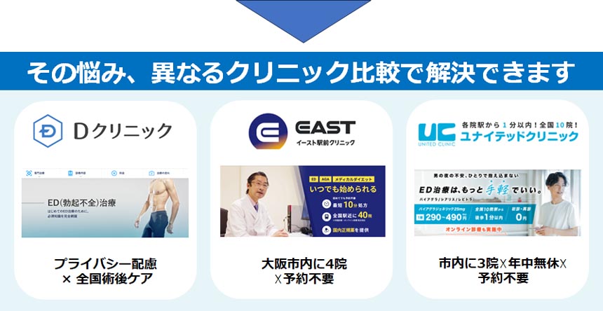 | Dクリニック大阪メンズ | イースト駅前クリニック | ユナイテッドクリニック | |