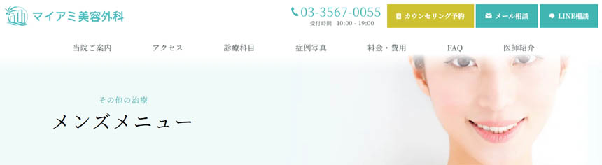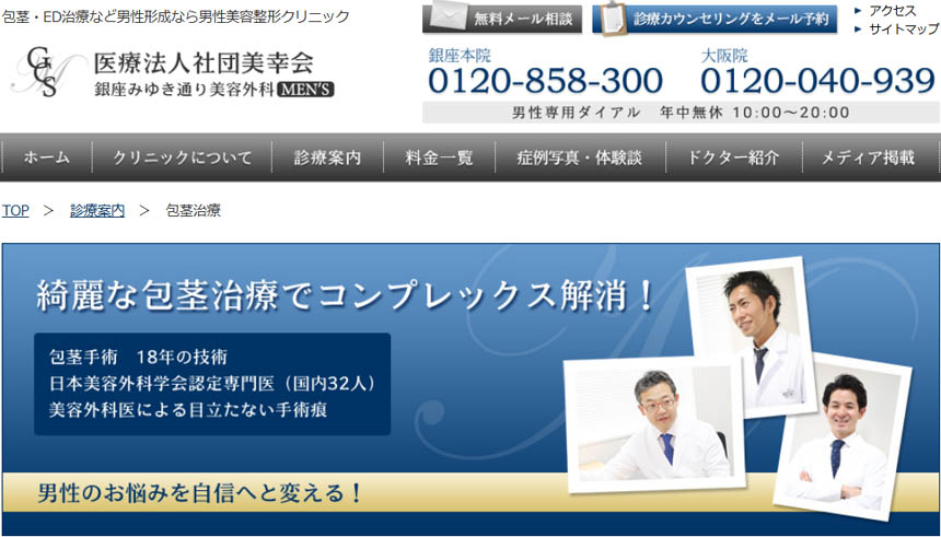 | 銀座みゆき通り美容外科MEN’S(銀座) | ★3.7(★3.74:①+②+③+④+⑤の平均) | ★3.7 119件 | ★3:包茎手術18年の技術で医師情報の記載あり。実績数の公表は無し。 | ★3: 仮性包茎治療:¥77,000 (抜糸式では+¥33,000) 真性包茎治療:¥187,000 (抜糸式では+¥33,000) カントン包茎治療:¥165,000 (抜糸式では+¥33,000) 背面切開術:¥33,000 小帯形成術:¥55,000 | ★4 ・完全予約制 ・完全個室カウンセリング ・女性美容外科も対応 | ★5 ・麻酔、薬、アフターケアが含まれた手術料金1年間無料保証 |