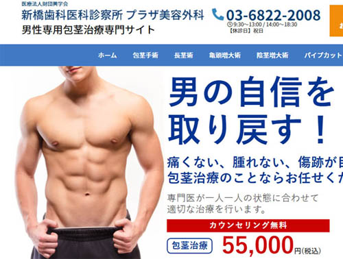 | 新橋歯科医科診療所 プラザ美容外科 | ★4.2(★4.16:①+②+③+④+⑤の平均) | ★4.8 18件 | ★5:医師情報の記載が有り、包茎治療実績1,500件以上 | ★2: クランプ法無血環状切開術 包茎治療:モニター価格55,000円(税込) ※通常価格で施術の場合は、110,000円 亀頭直下ダブルVカット法] 220,000円(税込) 真性包茎・嵌頓包茎 330,000円(税込) カウンセリング:無料 | ★4 ・完全予約制 ・完全個室カウンセリング ・女性美容外科も対応 | ★5 ・アフターケア有り ・入院・通院は不要 |