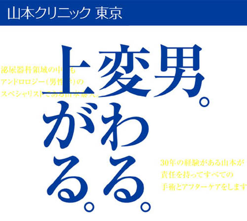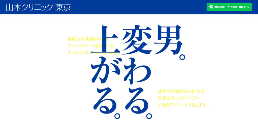 | 山本クリニック東京|男性専科(陰茎増大術・包茎手術) | ★3.8(★3.8:①+②+③+④+⑤の平均) | ★5.0 4件 | ★3:30年の経歴の山本院長が手術とアフターケアを担当。実績数の公表は無し。 | ★2: 包茎手術:150000円(税込) ※全ての手術料金は、薬、消毒、術後のガーゼ交換の費用を含んだものです。 | ★4 ・完全予約制 ・完全個室カウンセリング | ★5 手術後は医師と直接LINEを交換していただきます。休診日や診察時間外でも対応可能です。 |