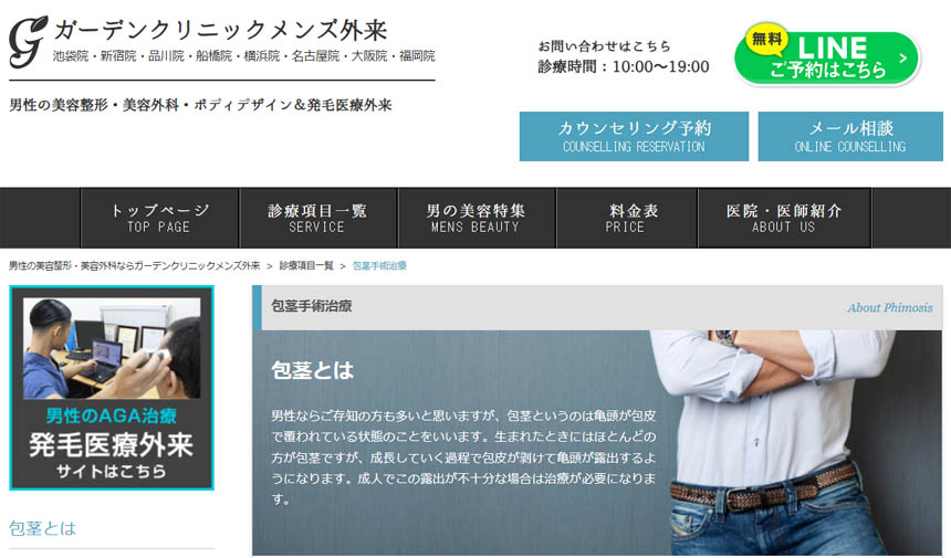| ガーデンクリニックメンズ外来池袋院 | ★3.2 (★3.22:①+②+③+④+⑤の平均) | ★ー 0件 (★4.1 270件) | ★3:院の医師情報の記載が有り、実績数は記載なし。 | ★3 包茎手術:88,000円(税込) 美容包茎手術:165,000円(税込) 切らない治療:33,000円(税込) | ★3 ・完全予約制 ・個室カウンセリングと診療 ・男女美容外科 | ★5 ・アフターケア有り ・追加費用なし(手術後支払い) ・電話相談無料 |
