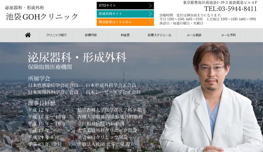 | 池袋GOHクリニック | ★3.7 (★3.72:①+②+③+④+⑤の平均) | ★4.6 72件 | ★3:院の医師情報の記載が有り、実績数は記載なし。 | ★3 仮性包茎:110,000円 カントン包茎:132,000円 真性包茎:165,000円 抜糸式:プラス11,000円 小帯温存:55,000円 | ★3 ・予約制 ・個室カウンセリングと診療 ・雑居ビル開院 | ★5 ・アフターケア有り ・追加費用なし ・個別ケア |