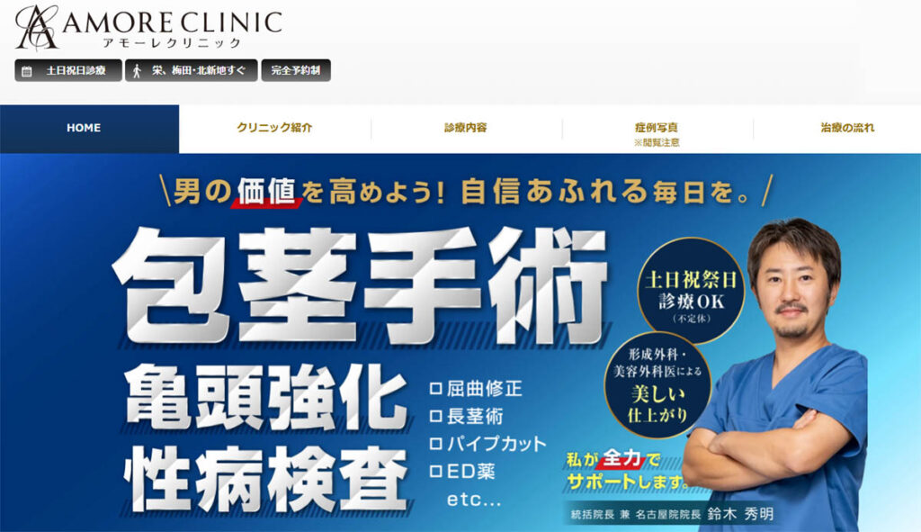 | アモーレクリニック 名古屋院(栄) | ★3.6 (★3.6:①+②+③+④+⑤の平均) | ★4.0 | ★3:多くの美容・形成外科クリニックを経験した医師が院長、実績数は非公開、 | ★1 環状切開術:297,000円 ウェーブ法:350,000円 クランプ法:418,000円 根部切開法:450,000円 カントン包茎の場合:143,000円 真性包茎の場合:165,000円 | ★5 ・完全予約制 ・個室カウンセリングと診療 ・男女美容外科(男性のみで対応) | ★5 ・アフターケア有り ・追加費用なし ・24時間相談無料 |