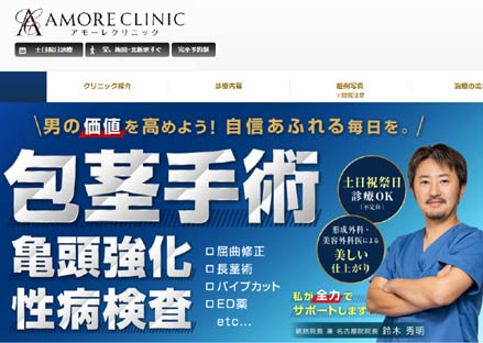 | アモーレクリニック 名古屋院(栄) | ★3.6 (★3.6:①+②+③+④+⑤の平均) | ★4.0 | ★3:多くの美容・形成外科クリニックを経験した医師が院長、実績数は非公開、 | ★1 環状切開術:297,000円 ウェーブ法:350,000円 クランプ法:418,000円 根部切開法:450,000円 カントン包茎の場合:143,000円 真性包茎の場合:165,000円 | ★5 ・完全予約制 ・個室カウンセリングと診療 ・男女美容外科(男性のみで対応) | ★5 ・アフターケア有り ・追加費用なし ・24時間相談無料 |