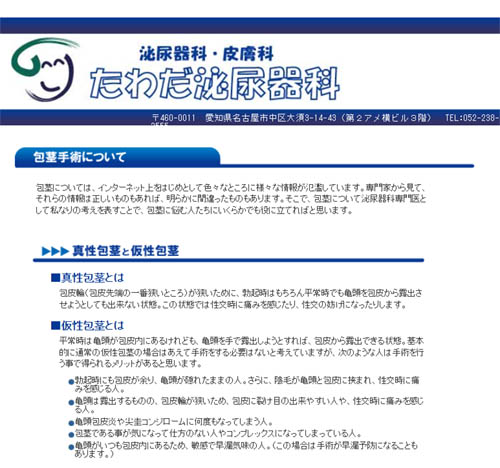 | たわだ泌尿器科 (大須) | ★3.2 (★3.23:①+②+③の平均) | ★4.7 | ★3:泌尿器科専門医で元常滑市民病院泌尿器科部長が院長、実績数は非公開、 | ★2 環状切開術:120,000円 | ★ー ・一般泌尿器科医院 | ★ー 要確認 |