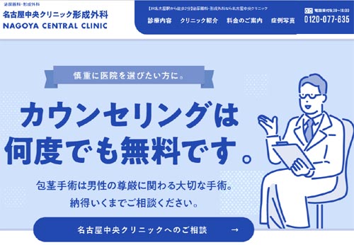 | 名古屋中央クリニック形成外科 | ★3.5 (★3.48:①+②+③+④+⑤の平均) | ★4.4 | ★3:美容外科歴10年以上の医師が治療、実績数は非公開、 | ★2 仮性包茎:77,000円 真性・カントン:165,000円 小帯温存(V字切開):77,000円 抜糸有り(ナイロン糸):22,000円 | ★3 ・完全予約制 ・個室カウンセリングと診療 ・男女美容外科(男性のみで対応) | ★5 ・アフターケア有り ・追加費用なし ・電話相談無料 |