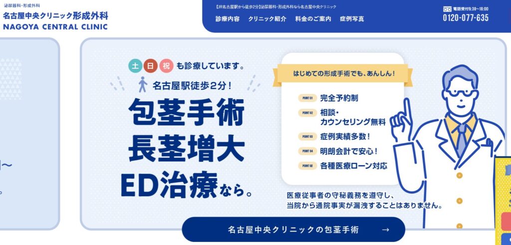 名古屋中央クリニックは、JR名古屋駅から徒歩圏内にある形成外科系のクリニックで、包茎手術を含む男性向け治療にも対応しています。