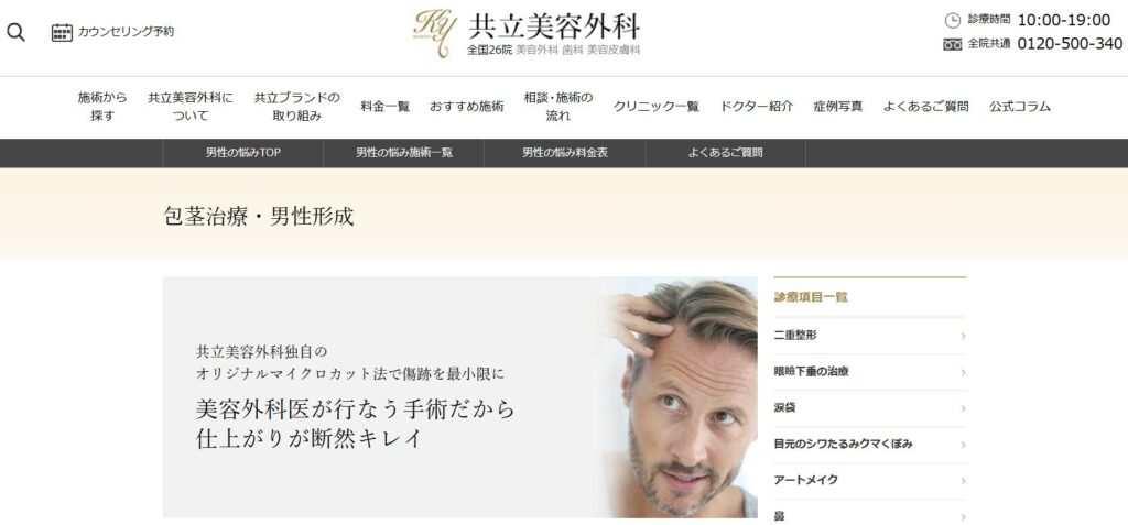 共立美容外科は、全国に複数院を展開する大手美容外科グループで、名古屋院でも男性向け治療の一環として包茎手術に対応しています。