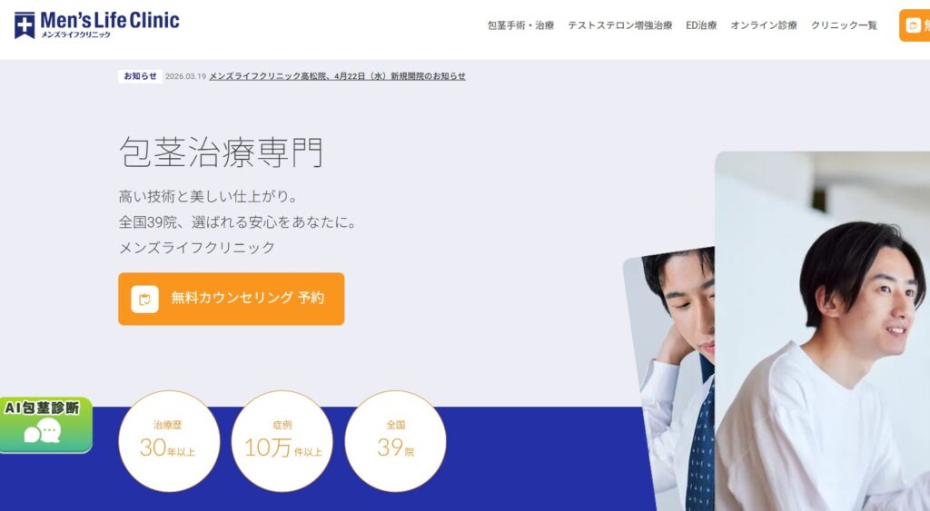 メンズライフクリニックは、全国に39院を展開し、治療歴が30年以上で症例が10万件以上※あるメンズクリニックです。