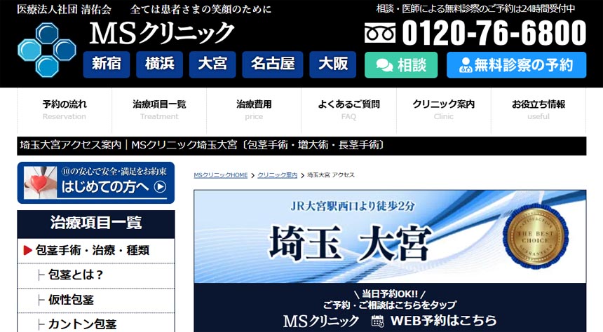 | MSクリニック大宮院 | ★4.5 (★4.5:①+②+③+④+⑤の平均) | ★4.5 6件 | ★5:院の医師情報の記載が有り、症例数・実績は30,000件以上。 | ★3 亀頭直下埋没法基本切除:99,000円 亀頭直下埋没法精密切除:220,000円 ほか | ★5 ・完全予約制 ・男性スタッフのみ ・個室カウンセリングと診療 | ★5 ・アフターケア有り ・追加費用なし ・24時間相談無料 |