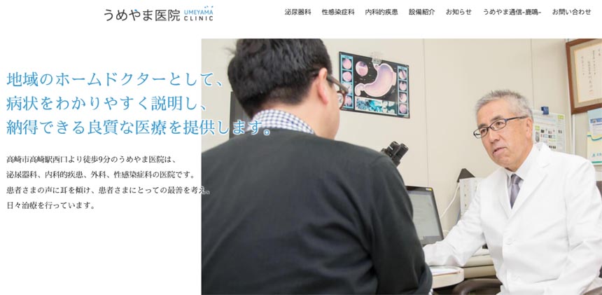 うめやま医院は、高崎駅西口より徒歩9分の場所にある地域密着型の、泌尿器科、内科的疾患、外科、性感染症科の一般診療医院です。