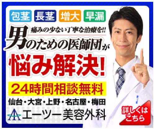 | 包茎手術料金 | 仮性包茎手術:77,000円 嵌頓(カントン)包茎手術:132000円 真性包茎手術:198000円 別途 麻酔代:33,000円 |