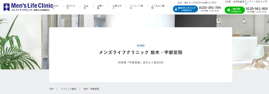 メンズライフクリニックは全国に34院を展開し、総来院者30年間10万件の実績がある包茎治療からED治療まで提供する男性専門のメンズクリニック(美容外科)で、栃木・宇都宮院はJR宇都宮駅西口から徒歩2分の便利な場所に在ります。