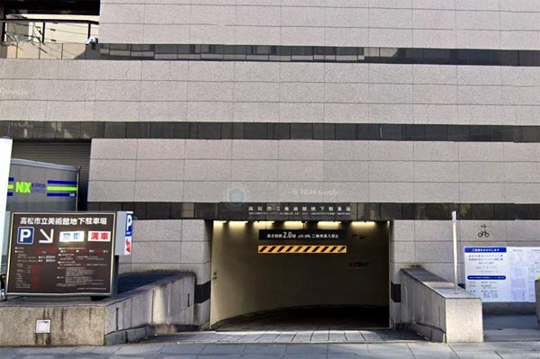 | 2.高松市立美術館地下駐車場 | 徒歩1分 | 【全日】 7:30~23:00 25分/100円 最大料金 7:30~18:00まで 1,200円 18:00~7:30まで 800円 (23:00~7:30出庫不可) | 144台 | 香川県高松市紺屋町10番地4 |