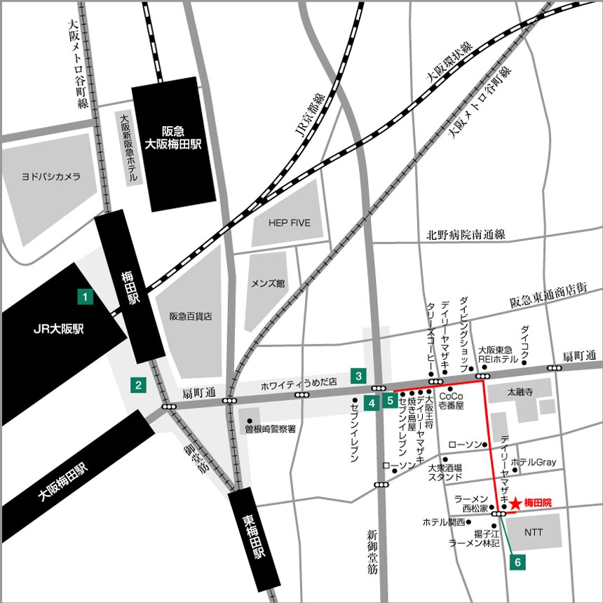 梅田院はJR大阪駅 御堂筋口より徒歩10分の便利な場所に在ります。