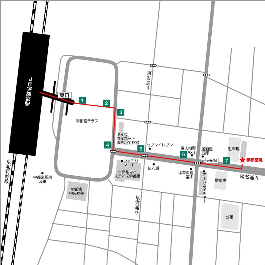 宇都宮院は、JR宇都宮駅 東口より徒歩10分の場所にあります。