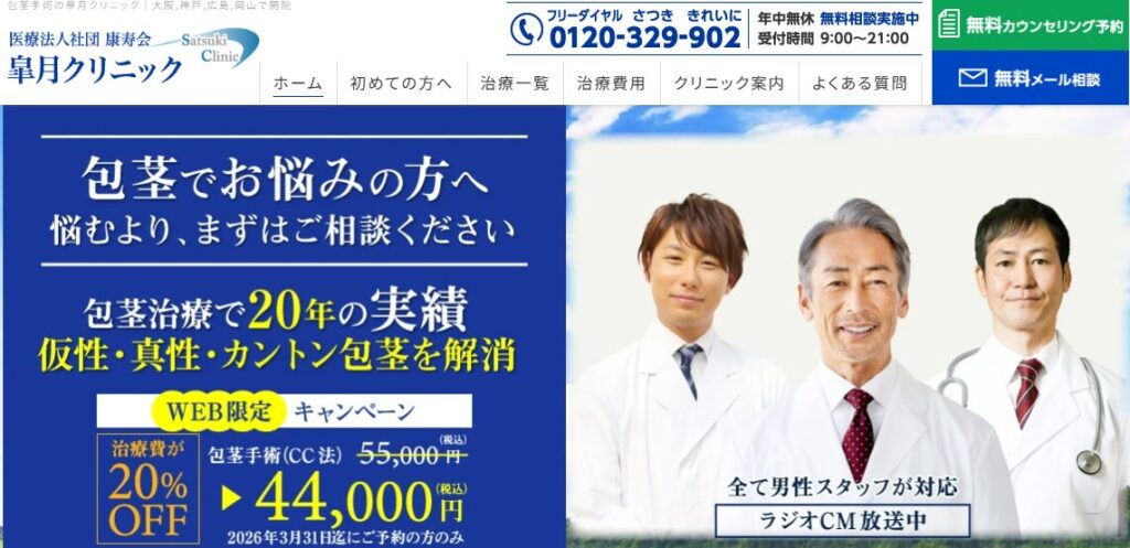 皐月(さつき)クリニックは関西・中国エリアに展開するメンズクリニック(美容外科)で、大阪・神戸で20年の実績がある包茎治療のスペシャリストです。