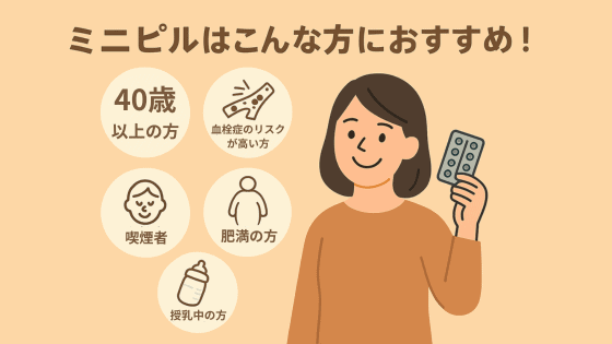 たとえば35歳以上の喫煙者や授乳中の方、偏頭痛持ちの方などはミニピルのほうが身体に合いやすい傾向があります。
