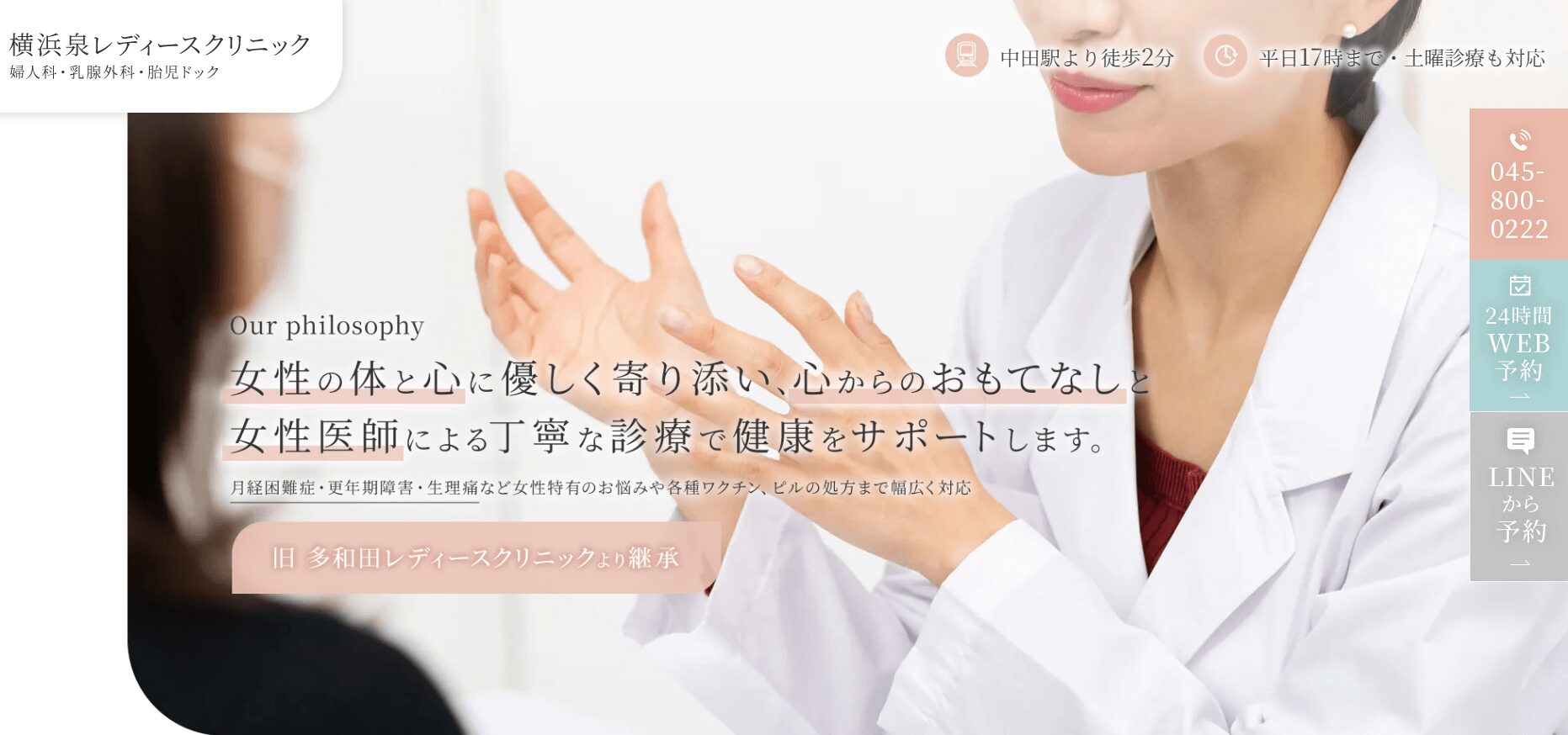 「横浜泉レディースクリニック」は湘南台駅からは車で17分ですが、中田駅から徒歩2分という好立地がおすすめポイントです。
