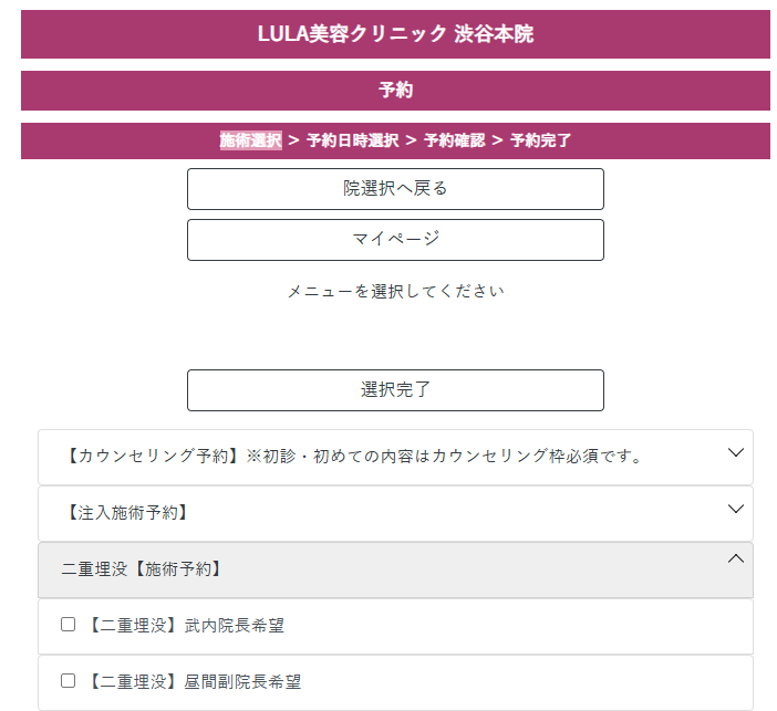 ルラ(LULA)美容クリニックでは、WEBカウンセリング予約時に各施術ごとにドクターを指名することが可能です。ココでプルダウンメニューから武内院長を指名することができるという簡単なWEB予約になっています。