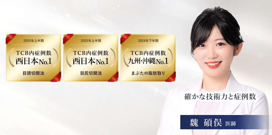 魏 碩俣先生はTCBの目頭と目尻切開で西日本エリア症例数No,1、まぶたの脂肪取りで九州・沖縄エリア症例数No,1を持つ実績あるドクターです。「施術のうまさ」だけでなく、安全性と美的センスの両立を重視している信頼できる先生でもあります。埋没法での施術は、腫れにくく、ダウンタイムが少ない施術を心がけているそうです。