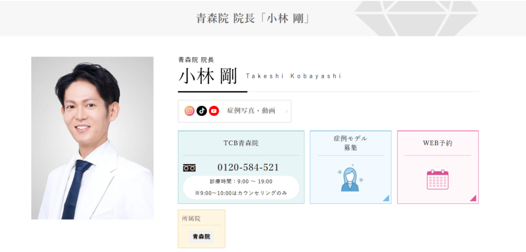 TCB青森院の院長は小林 剛(こばやし たけし)医師です。青森院の口コミ数1位の先生でもあります。さらに、青森エリアで「二重整形」「クマ取り整形」の症例数がNO.1の先生でもあります。