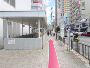 - ⑦断歩道を通過し少し進むと、左手にショーウィンドウのあるビル「近代グループBLD.23号館」があります。