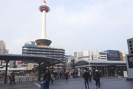 - ①JR京都駅中央改札口から京都タワーに向かって進んでいただきます。