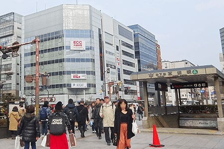 - ②交差点を「ECC外語学院」「カメラのキタムラ」「コンタクトのアイシティ」の看板に向かって斜めに信号を渡ってください。