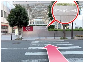 - ⑤松戸市文化ホール前の横断歩道を渡ってきてください。