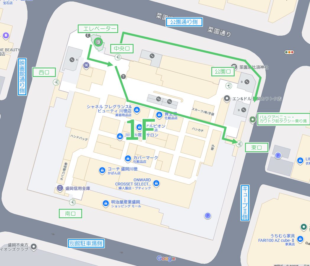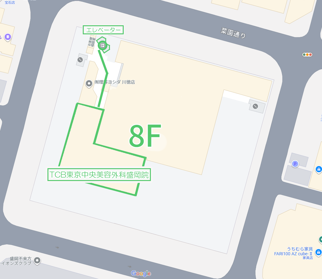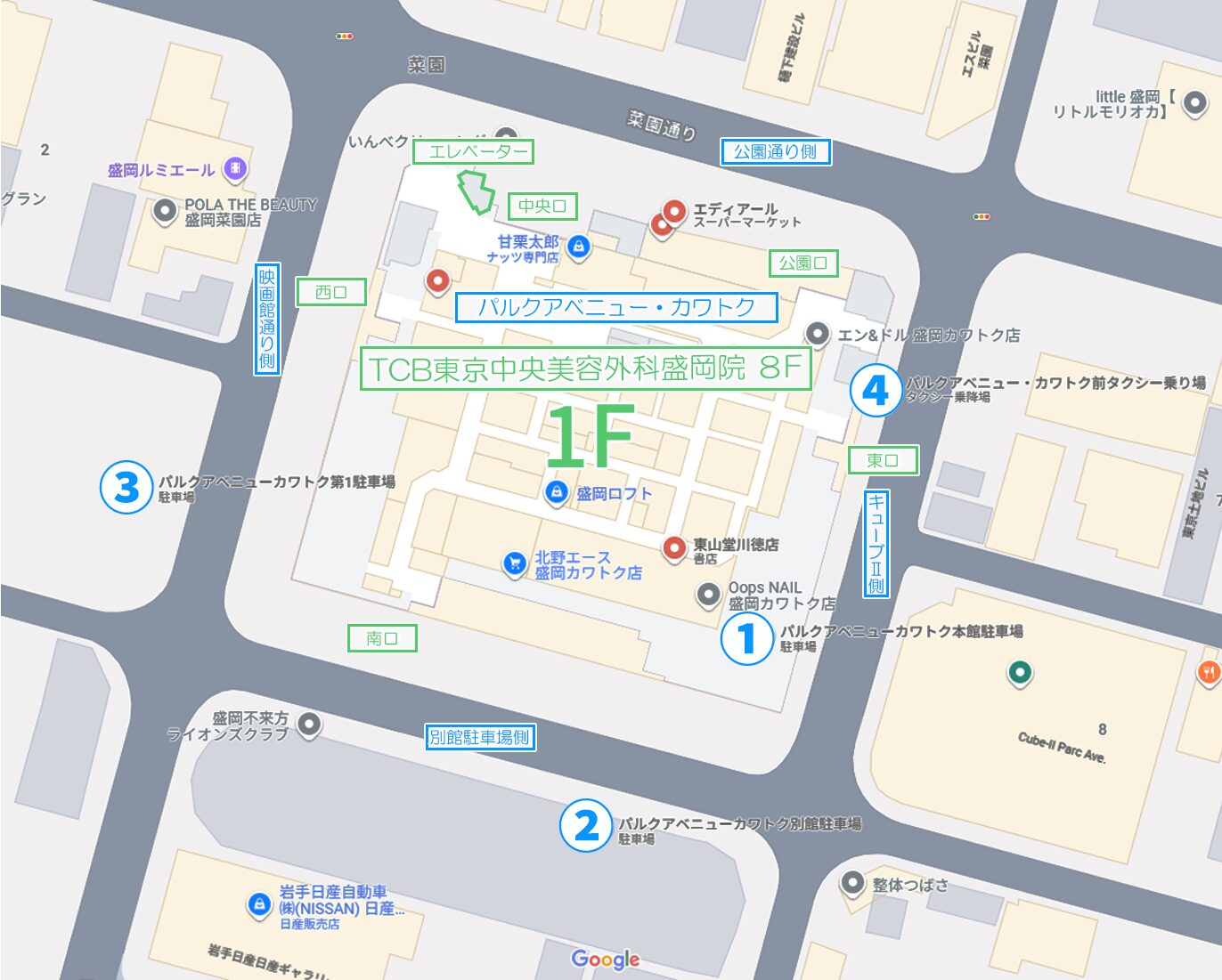 地図の中央が、パルクアベニュー・カワトクです。同ビルの8Fが「TCB盛岡院」です。