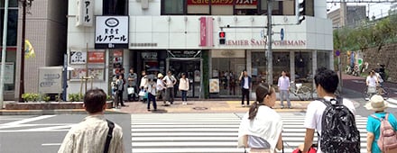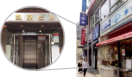 - ④1Fに東京風月堂、庄や、二代目武道家が入ったビルが見えてきます。
