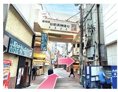 - ④道なりにまっすぐ進み、お初天神通り商店街のアーケードを右に曲がります。