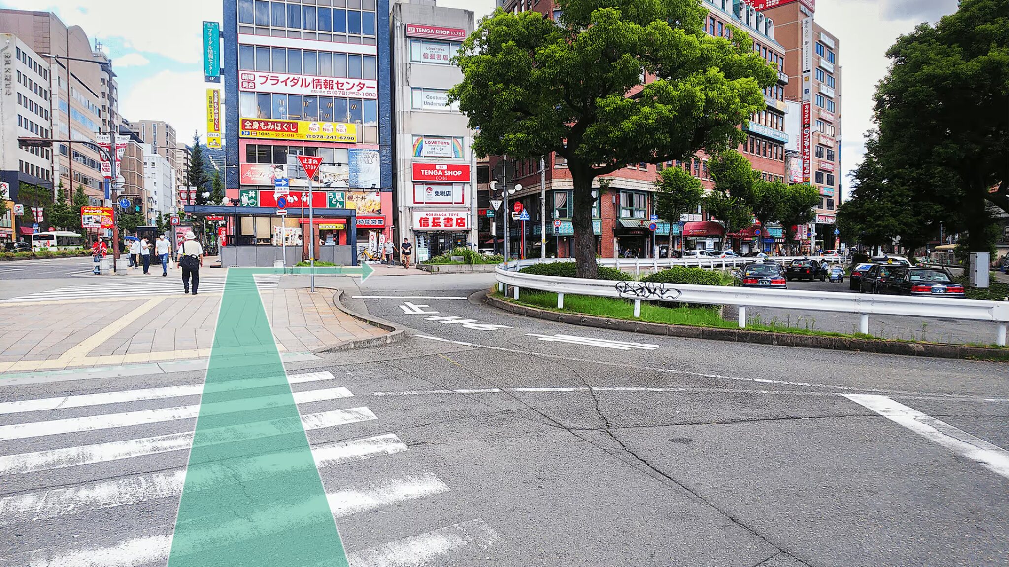 ③タクシー乗り場と大きなスクランブル交差点が見えてくるので、スクランブル交差点を渡って右折します。