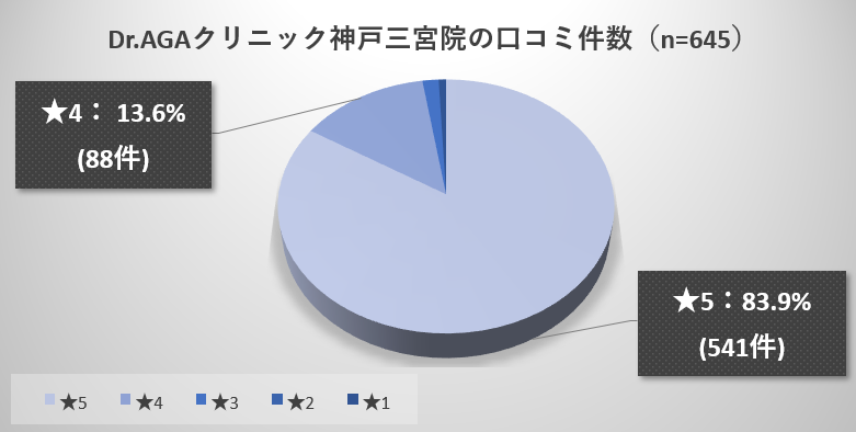 最初にDr.AGAクリニック神戸三宮院に対する約650人の口コミを調査した結果の全体像を俯瞰しましょう。(引用:Googleマップ)