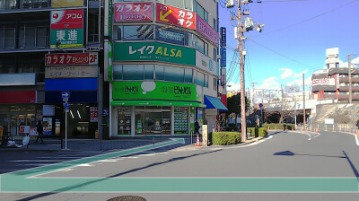 ④駐輪場を抜けると十字路が見えてくるので、「レイクALSA」や「BIG ECHO」の建物を直進します。