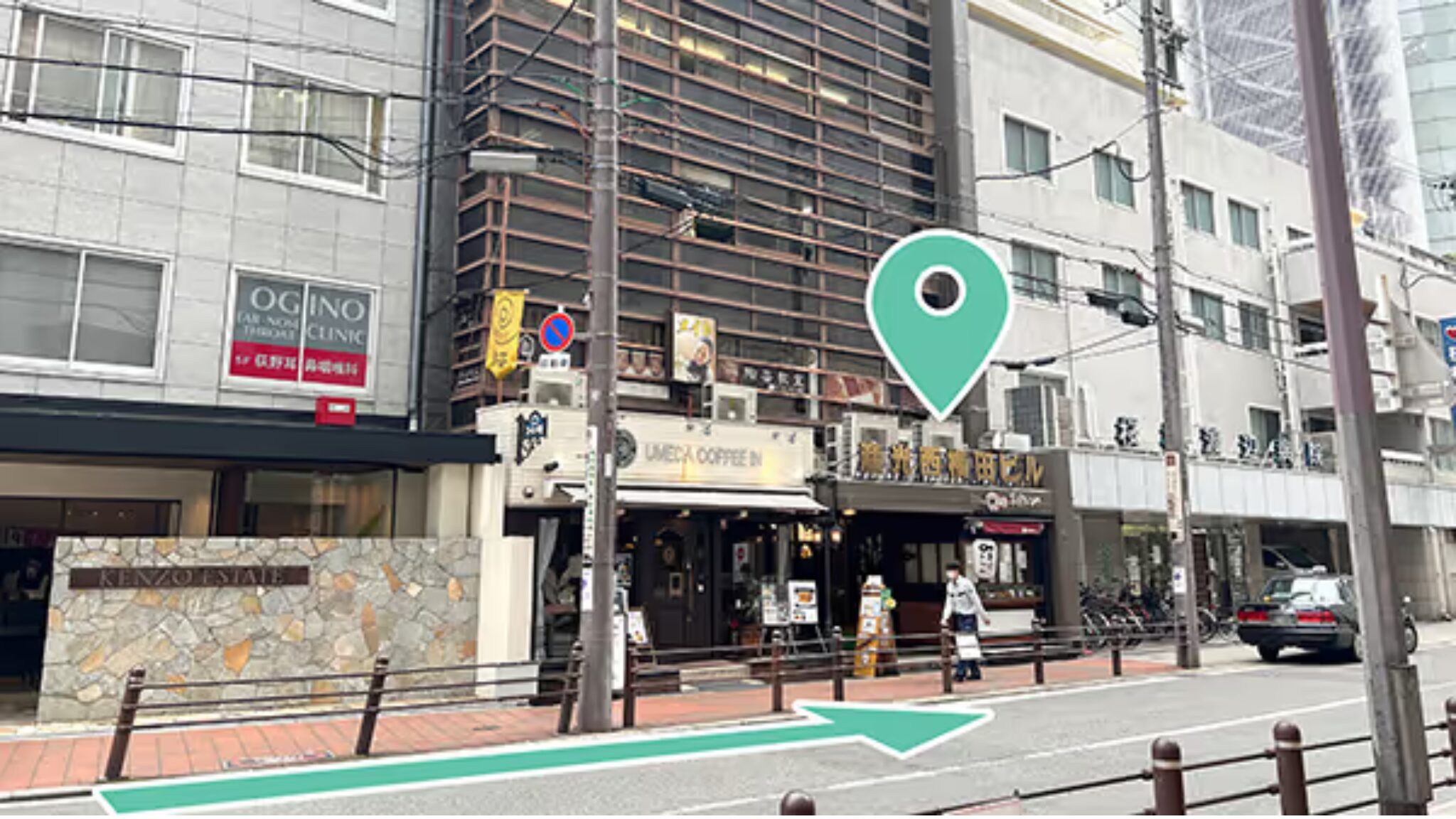 ⑥直進すると左手に茶色い建物で「産光西梅田ビル」と書かれたビルがあります。隣は桜橋渡辺病院です。