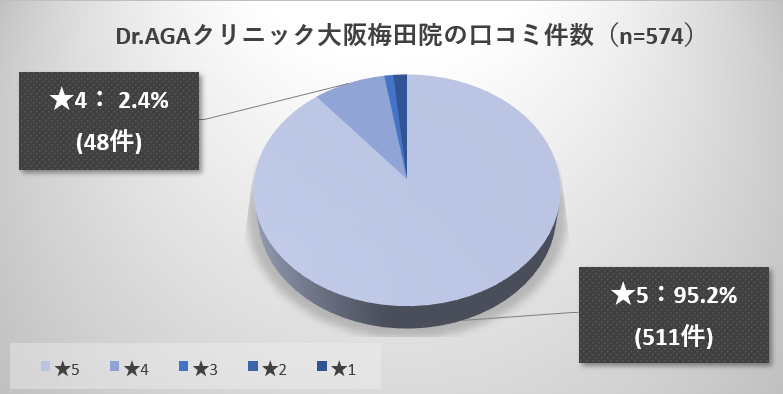 最初にDr.AGAクリニック大阪梅田院に対する約600人の口コミを調査した結果の全体像を俯瞰しましょう。(引用:Googleマップ)