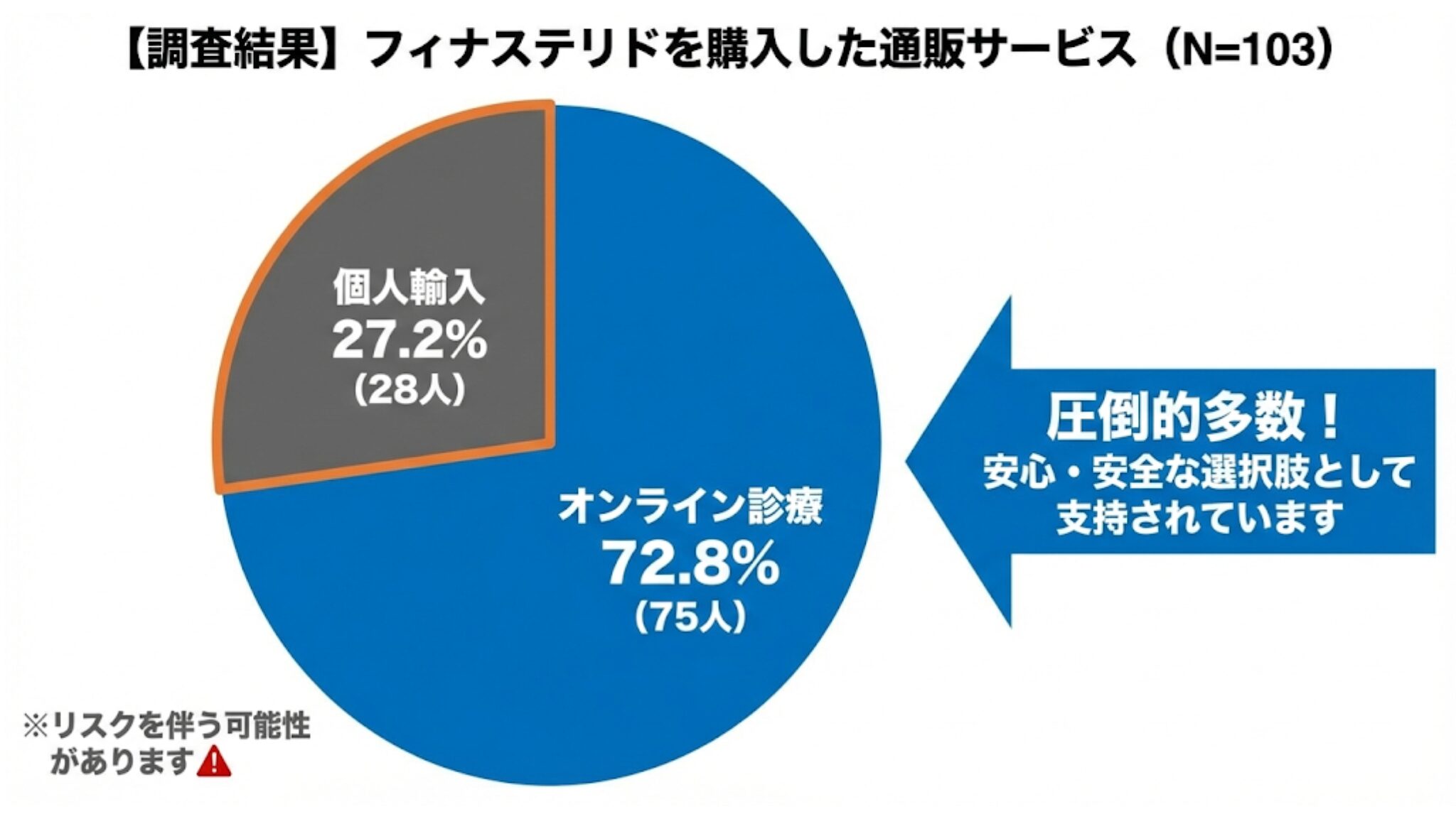 上記のグラフの通り、フィナステリドの購入先として103人中75人がオンライン診療を利用しており、全体の72%以上を占めていることが分かりました。