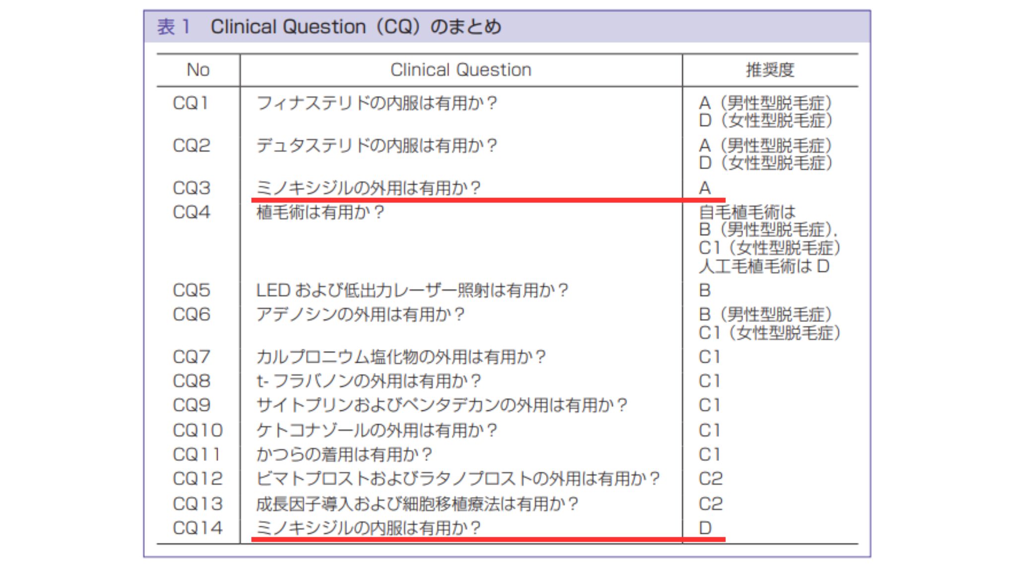 一方でミノキシジル外用薬については、ガイドライン上で最も推奨度の高い「推奨度A」に分類されており、AGA治療として広く用いられています。