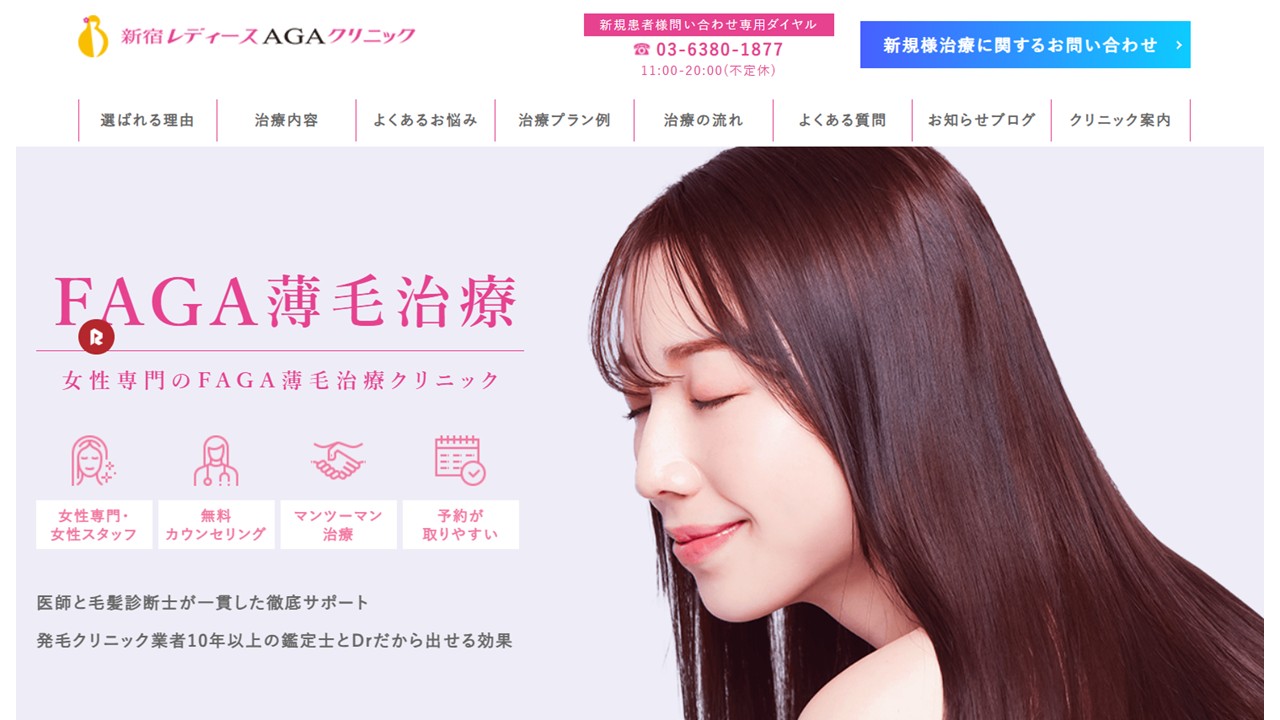 - おすすめ④:駅前AGAクリニック新宿院|女性に特化したクリニック。オーダーメイド治療は600種から選択
