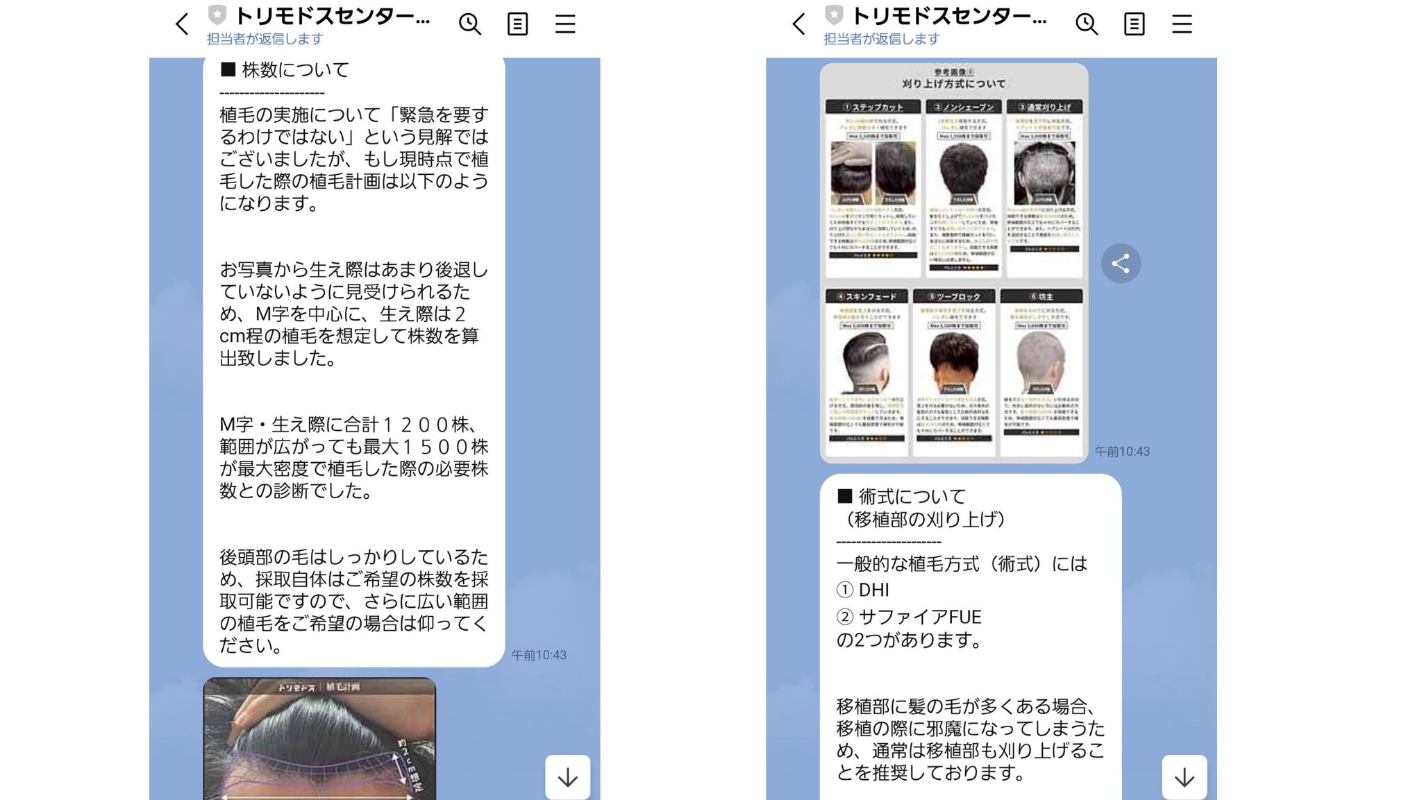 私の口コミ①:事前のLINEが非常に丁寧&詳細に植毛計画を立ててくれる