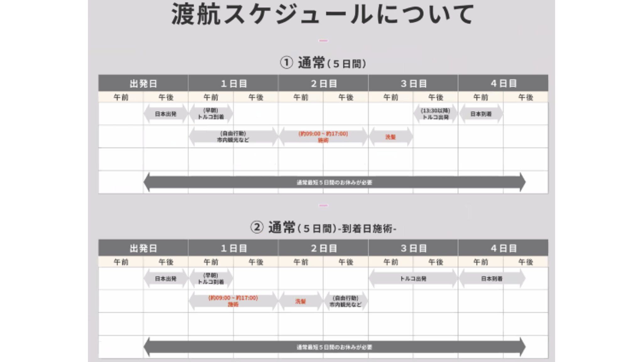 イスタンブール市内において自由行動の観光等を除いた「施術時」「空港でのお迎え」に通訳が同行します。